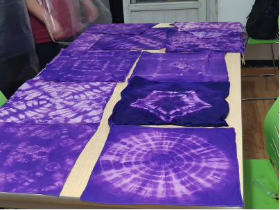 在活動過程中,同學們充分發揮創意,以“芒種”為靈感,將麥浪、荷花等夏日意象融入扎染設計。有的同學精心扎出荷葉舒展的形態,有的同學巧妙染出陽光斑駁的效果。大家運用不同的扎結手法,將布料塑造成獨特的模樣,再放入染液中浸染。在等待色彩暈染的過程中,同學們相互交流,分享自己的創意構思,現場氣氛熱烈而融洽,增進了彼此間的友誼與情感交流。