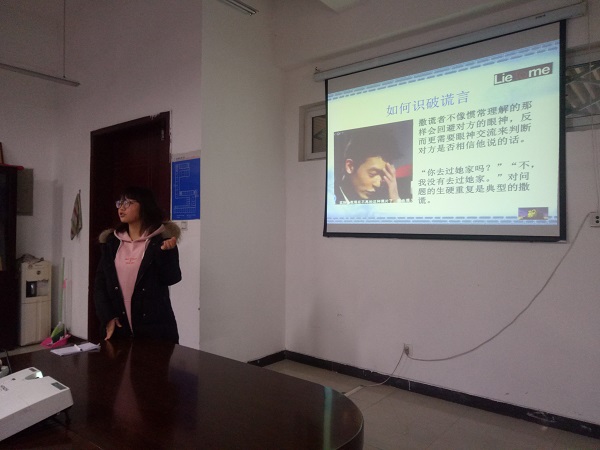 活動開始時,同學們先通過觀看《lie to me》其中的小片段來了解到微表情的力量和微表情的神奇用處。然后主講人生動講解一個又一個充滿未知的“微表情”,同學們好奇且仔細的聆聽著每一個表情后的“真相”。“憤怒”——眉毛下垂且并攢,眼睛怒視,嘴角緊鎖?!绑@訝”——眉毛上揚,兩眼瞪大,嘴巴微微張開?!氨瘋薄蠈友燮は麓梗p眼無光,雙側嘴角微微下拉。一個又一個的微表情被深層解讀。