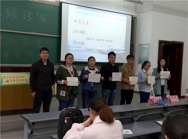 據(jù)悉,14、15、16級共有24個寢室獲得優(yōu)秀之家稱號。其中,獲得模范之家稱號的分別是16級的605、608、609寢室,14級的315、218、206寢室。頒獎儀式后,生活部委員向同學(xué)們介紹了本學(xué)期三級建家的標(biāo)準(zhǔn)。本學(xué)期三級建家標(biāo)準(zhǔn)大致與上學(xué)期一樣,其中略微不同的是此次三級建家不再以班級為單位建設(shè),而是以寢室為單位建設(shè)。接著,來自15級的330寢室向同學(xué)們做了風(fēng)采展示,寢室代表從生活、學(xué)習(xí)兩個方面展示了330成員的勤奮好學(xué),友善和諧。