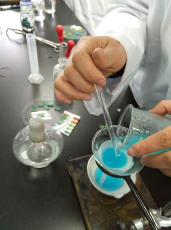羅米娜老師多年從事無機化學及分析化學方面的教學,邱海燕老師長期從事油田化學品的研發(fā)和應用方面的教學科研工作。兩位老師以她們豐富的學識和傾心的講授令助教們獲益匪淺。對搞科學的人來說,勤奮就是成功之母。羅米娜老師首先強調(diào)了提前準備實驗,查閱相關(guān)知識對于實驗和科學研究的重要性。然后,老師從硫酸銅的提純原理開始,生動又形象的講解了粗硫酸銅中常見的兩種雜質(zhì)及其去除的方法。在助教們自己做實驗的過程中,老師時時詢問和查看實驗的進行情況,每當助教團成員有問題出現(xiàn),都能得到老師耐心及時的幫助。正確操作,細致觀察,這是所有化工人都應遵守的一條戒律。邱海燕老師秉承嚴謹?shù)目茖W態(tài)度,首先從沉淀溶解平衡和沉淀滴定原理的角度細致講解了莫爾法測定可溶性氯化物中氯含量的原理和實驗方法,然后強調(diào)了實驗過程中會影響實驗結(jié)果準確性的各種因素和注意事項。在隨后的實驗過程中,邱老師又對同學們進行了更為詳細的指導。