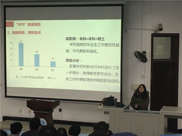 此次年級大會以鄭璇老師為同學們講述自己帶領實習山東京博公司作為開端,以生動形象的例子告誡同學們一定要規劃好自己的人生,特別是在大三的后期。“GPS的準定位”部分中,鄭老師以“像經營一個品牌豐富自己、營銷自己”作為切入點,對目前所處的嚴峻的就業形勢以及就業率進行了深入的分析,針對不同學歷層次的就業滿意度、專業相關度、平均月薪、工作穩定性等數據進行了分析比較。第二部分以“GPS動力源”為主題,這部分以鄭璇老師在工作和生活中了解到的困擾同學們的難題來引入,主要對比了學院本科各專業的就業情況和考研情況。隨著四大石油公司就業百分比的下降,選擇知名石化民營企業和非對口就業的學生逐漸增多。鄭老師說:“決心一旦做出,便要義無反顧、勇往直前。明白去哪里,世界都會為你讓路。” 并且再次強調了四六級、計算機二級以及各類資格證書對于提高自身就業競爭力的重要性。對于考研,鄭老師推薦了部分資料性和學術性的網站以及獲取專業課資料的方式,并且對考研復習計劃和重要時間安排也進行了一一地展示。鄭老師鼓勵大家:“考研最難的不是算不出題目看不懂單詞,尤為可貴是那種單槍匹馬戰斗的勇氣與堅持。”最后,鄭璇老師表示下一步學院將會舉辦各類活動,如:就業簡歷制作和面試講座,為同學們解決職業發展困惑;分專業年級開展考研交流會,邀請上一屆考研的學長學姐們面對面為考研的同學指導復習規劃和備考經驗等。