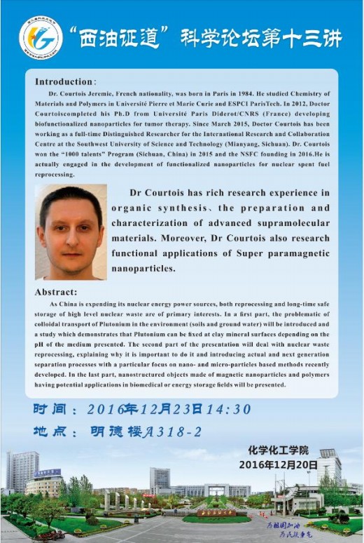2016年12月23日,第十三期“西油證道”科學論壇邀請到了西南科技大學的Dr. Courtois Jeremie作為主講人,唐鋆磊老師、Dr.Chamas作為特邀嘉賓,以“如何利用納米微粒處理核廢料”為專題進行了一場全英文學術交流活動。Dr.Courtois Jeremie從三個方面進行了學術分享。首先,從環境中的钚元素講起,對钚的產生、钚的擴散機理進行了介紹;其次,Dr.Courtois Jeremie對核廢料的處理做了進一步的介紹;最后,Dr.Courtois Jeremie對用磁性納米顆粒處理核廢料進行了分享,分別從氧化鐵納米顆粒的合成、絡合作用中離子強度的直接混合效果、磁場作用下的脫鹽動力學過程、燃料棒的產生機理這四個方面一一道來。
