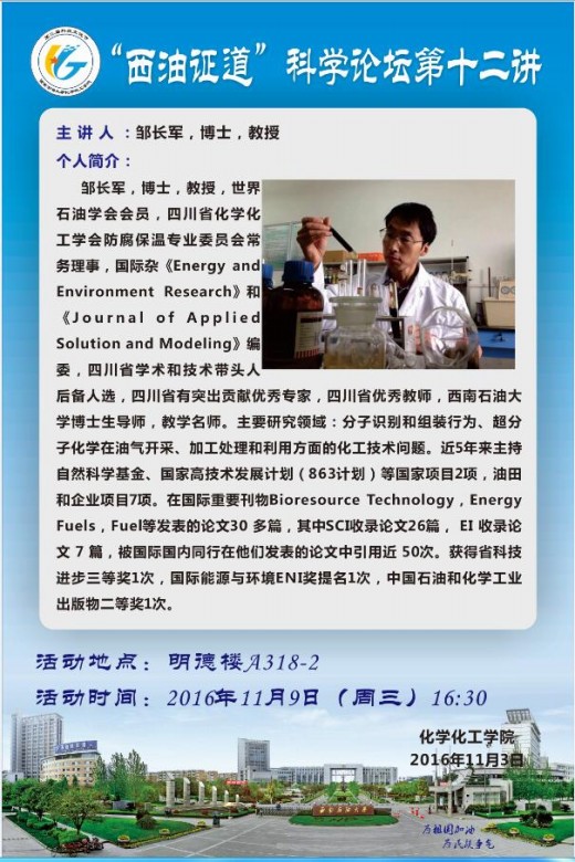 2016年11月9日,第十二期“西油證道”科學講壇邀請到了鄒長軍教授作為主講人,唐鋆磊老師作為特邀嘉賓,兩位老師傳道授業解惑,在如何做一名合格的研究生、如何做實驗、如何學習以及研究生應具備的科研心態等多方面為研究生同學做出引導。鄒老師從“為什么學”講起,點出在中國現代充滿了浮躁的社會背景,在智慧不斷清零的時代,唯有學習是做到不浮躁的關鍵,也是實現人生目標的捷徑。而科學教育核心就是要培養稱職的專業人才,培養獨立的個性,培養追求真理的精神。