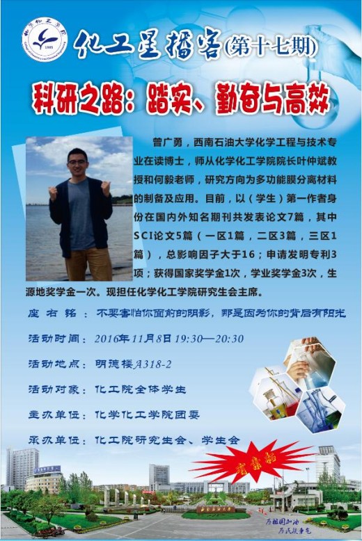 2016年11月11日第十七期“化工‘星’播客”主講嘉賓曾廣勇從“勤奮、踏實、高效”三個方面分享了自己的科研經驗和研究生規劃。首先,曾廣勇給同學們分享了自己的科研經驗,主要分為文獻的查閱與整理、實驗方案的設計與數據處理、論文的寫作與發表三大板塊;之后,他提到自己的研究生規劃:制定小目標,完成大目標;最后,曾廣勇告訴大家:“不要害怕面前的陰影,那是你背后有陽光;不能妄自菲薄、更不能妄自尊大;最美好的年齡段,沒理由不努力奮斗。”