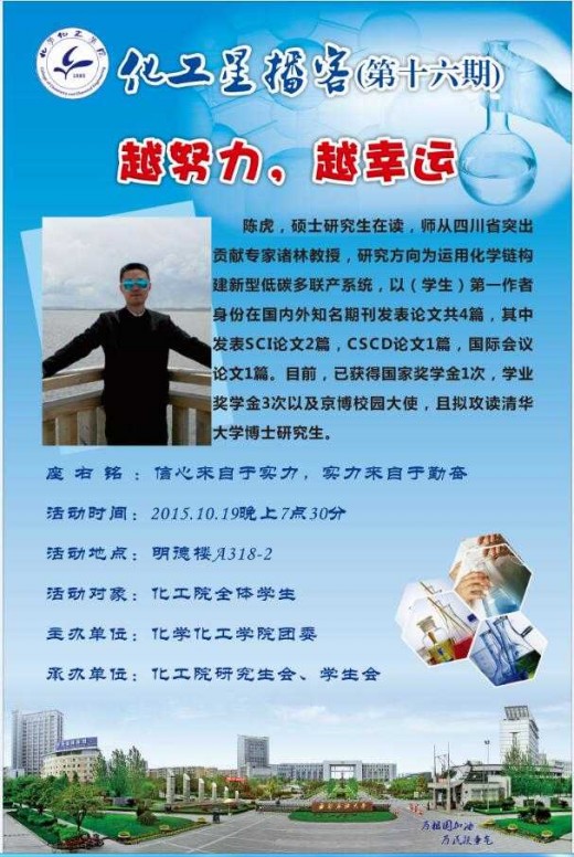2016年10月19日,第十六期“化工‘星’播客”邀請到了師從諸林教授的陳虎分享他的求學經歷和學旅生涯。以“信心來自于實力,實力來自與勤奮”為座右銘的陳虎首先與同學們分享了他本科階段的學習經歷,如何學好各種專業知識,提升自己的專業技能等;說到研究生階段的發展,陳虎也繪聲繪色地給大家講述了他是如何選擇了現在的導師團隊以及團隊選擇的重要性,PI項目申請過程以及申請失敗對他的鞭策,曲折的投稿經歷更讓他懂得堅持的道理,京博實習期間該企業文化對他的熏陶等等。