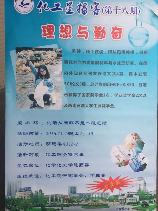 2016年11月24日,第十八期化工星播客邀請到了國家獎學金獲得者生陳婷作為主講嘉賓。“堅定理想信念,攻難克堅而行。”陳婷首先從自己小時候的理想講起引入本次講座的主題“勤奮”,而理想就好比一個導航,它告訴人們要去往何處,是黑暗中的“光”。但在實現理想的過程中,往往會遇到“毀滅理想五部曲”:不要相信一夜成名,成功背后付出的汗水與艱辛別人是看不到的;不要依賴別人,人生的路要自己走、自己做決定;不要安逸度日,達到一個巔峰后,需要更加努力,找到下一個巔峰;不要為失敗找借口;不要認為目標就是一切。