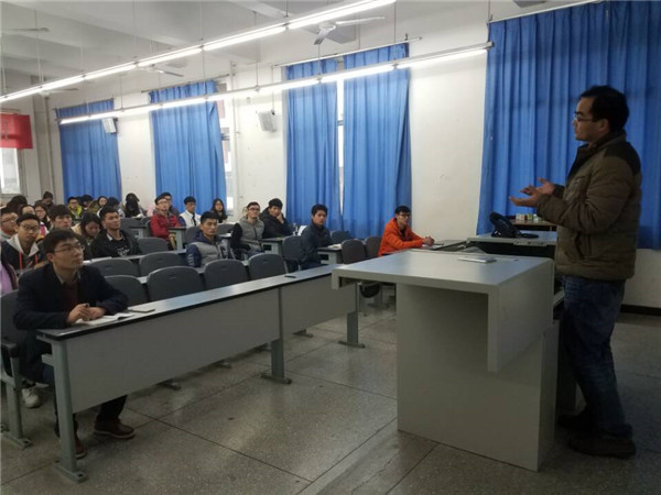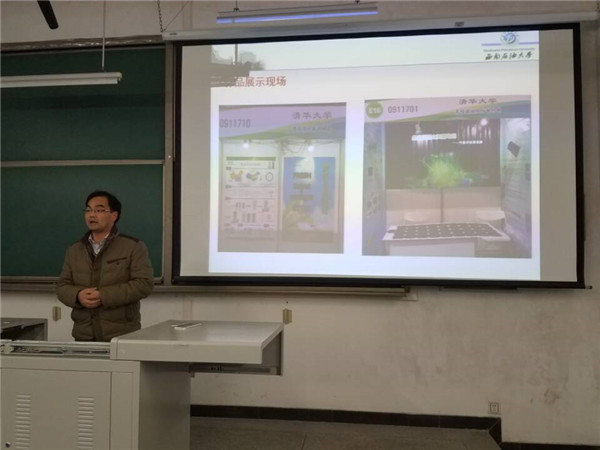 交流會正式開始前,蘭貴紅老師特地走下講臺與同學們進行面對面的交流,現場氛圍熱烈融洽。接著,蘭貴紅老師就競賽的目的、主題內容、參賽作品類型等方面做出詳細的介紹,并強調:“本次競賽的級別、評審團規格都相當高,同學們思想上應該高度重視,把握住難得的機會。”除了在技術方面的指導,他還向同學們介紹了我校在上一屆競賽中的得獎經歷,并用形象的“分母、分子”比喻來鼓勵同學們運用自己的特長和優勢爭做分子。同時,蘭貴紅老師還指出創新的重要性:“競賽將人文素養融合到科學知識技能之中,學以致用不僅體現于頭腦風暴,而且展示在精巧的創造之中。”最后,交流會還邀請到13級化工專業的王偉強學長與同學們分享他的參賽經歷。他著重闡述了自己對競賽意義的理解,并再次鼓勵同學們:“大學四年如果什么都不做,就平淡的像是一條直線;但如果你做了點什么,那就會像心電圖一樣有所起伏。”