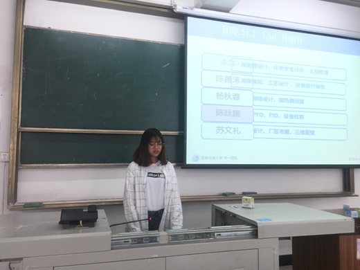 為更真實的還原比賽現場答辯,隊員嚴格按照比賽要求,規范著裝,脫稿答辯。培訓開始,Infinite團隊成員上臺依次對項目背景、工藝設計、設備設計、廠區布置、節能環保、經濟分析和項目總結進行答辯過程還原。天一隊隊員對項目背景、工藝闡述、廠區平面與三維、環境安全評估以及經濟分析幾個方面進行了解讀。Infinite團隊和天一隊答辯過程還原讓本期參賽同學深深的體會到比賽的規范性和專業性,在這之后獲獎團隊成員對本期參賽同學就化工設計大賽備賽中的問題進行了答疑。
