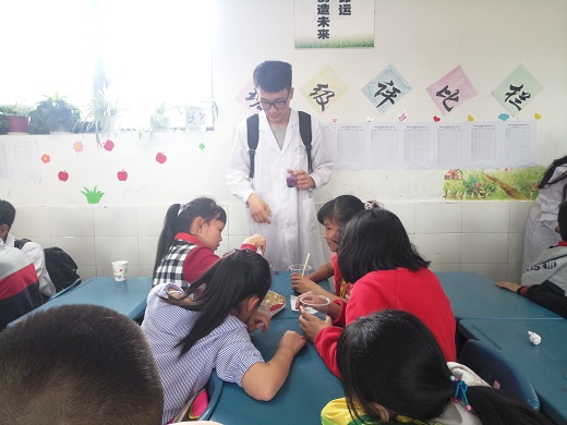 “燃燒成蛇”和 “神奇的茶水變色”兩個演示實驗演示完成后,志愿者們簡單的給小朋友們講了相關原理。之后,每個志愿者帶領四個小朋友完成兩個實驗項目,并在確保安全的情況下,讓每個小朋友親手去完成這些實驗。通過親手操作,小朋友們初步建立起了酸與堿的概念。