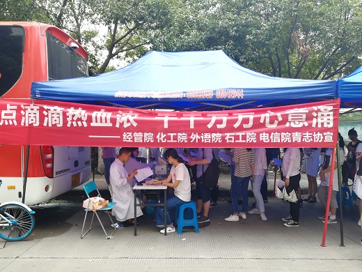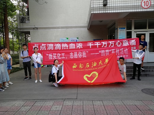 2018年5月16日,化工院青志協聯合經管院、外語院、電信院、石工院等四院青志協,開展了“愛心獻血”經典“四微”活動,本次活動旨在向西南石油大學全體學生宣傳十九大提出的青年奉獻精神,提高我校大學生的社會責任意識,營造團結、友愛、平等、和諧的校園氛圍。本次活動也倡導同學關愛社會,發揚大學生志愿者精神,增強大學生的道德修養,展現大學生高尚的情操,并讓我校學生對無償獻血知識有更深的認識。弘揚化工院傳統的“四微”精神、加大“四微”精神影響力也是我院青志協的活動目的之一。