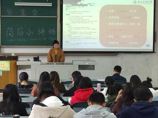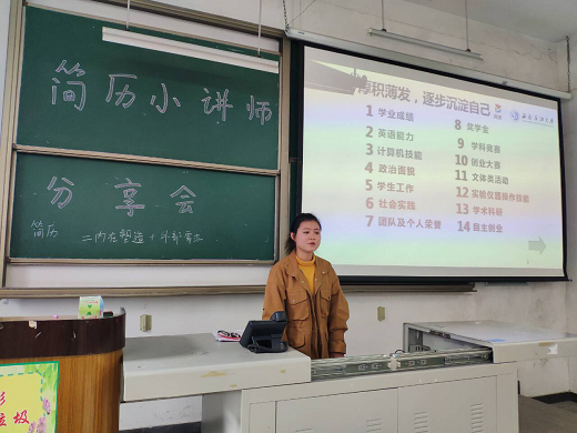 為了讓同學們更早的認清自己的職業規劃,打造屬于自己的簡歷,提升在求職中的競爭力。11月8日下午,化工院在明德樓A301開展簡歷小講師分享會。16級應用化學蔣茹芬同學作為此次分享會的主講人。