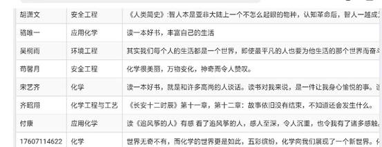 在線下晨讀中,同學們講述了自己校園故事,并且分享了一本大學期間對自己觸動最大的書籍以及讀此書時的感想。來自17級化工專業(yè)的張朝莉同學表示:“通過晨讀與學習經(jīng)驗交流,促使我們朋輩之間傳遞力量,激勵我們在校石大人拓寬眼界和視野,勤于讀書,不局限于書本卻又能安心回到書本,找到自己大學奮斗的目標,榮校愛校。”而線上的夜讀分享活動,通過院新媒體“石大化語”平臺,將我院優(yōu)秀學生代表分享的經(jīng)典書籍推送給全體師生共同分享,以此引發(fā)同學們內(nèi)心的思考,激勵同學們拓展眼界和視野,倡導同學們要勤于讀書且不局限于教材,要能夠真正的明確自己在大學的奮斗目標。其中,應用化學專業(yè)的胡雨倫同學,分享的《平凡的世界》,他表示:“全書講述了少平和郝紅梅的愛情故事,讓我們切實的體會到了那時候的農(nóng)村的生活面貌,對于我們了解農(nóng)村真實生活有一定的幫助。”