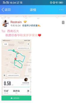 25日下午,正式開始打卡活動。參與者圍繞石大校園及周邊進行跑步健身。參與者或個人參與,或結成團隊一起參與活動,跑過石大校園,用奔跑將石大精神傳遞,用奔跑為母校獻禮,用奔跑祝母校蓬勃發展。參與者的臉上洋溢著笑容,爽朗的笑聲洋溢在石大校園的上空。為使健身跑路線形成“60”的字樣, “開啟”了各種花式跑步路線。跑步完成后,參與者將手機上所記錄的跑步路線截屏,并將截圖配上自己的祝福語,發往空間、朋友圈等社交平臺,完成對健身跑打卡曬祝福活動的接力并分享了對母校的祝福以及對未來的期待。