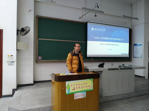 誠信是立身之本,學術誠信更是學生始終堅持的初心,關系著未來學術前途。為加強學術誠信教育,3月4日下午,化工院在明德樓A312開展研究生學術誠信教育大會暨畢業論文答辯說明會。化工院副院長唐鋆磊、研究生培養干事郝晶晶、研究生輔導員冷帥及2016級研究生參加本次大會。