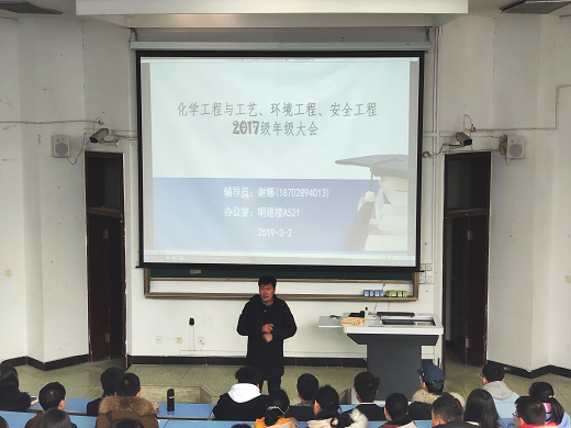 3月2日上午9點,化工院于思學樓B110舉辦2017級學風教育年級大會。本次大會旨在總結2017級同學們在上一學期的學習情況、布置本學期學習任務、鼓勵同學們繼續努力學習。學院副院長張輝、工業危廢研究院院長劉宇程、教師代表李敏等作為班主任,參與了此次年級大會。輔導員謝娜主持。