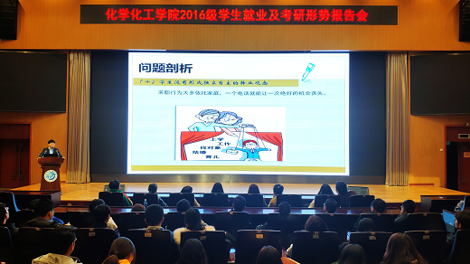 3月14日晚,化工院2016級學生就業及考研形勢報告會在圖書館報告廳舉行。學校招生就業處副處長肖友平、化工院副院長唐鋆磊應邀分別作就業、考研形勢報告。大會由化工院黨委副書記陳剛主持。