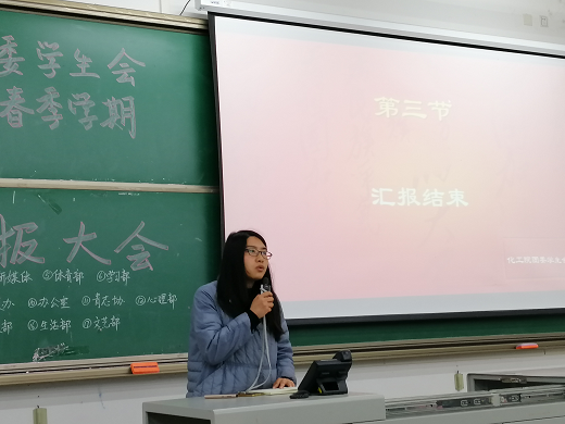 大會伊始,學生會主席團執行主席冷添對學生會近一年的工作進行總結。他在闡述中表示,“打鐵還需自身硬”,主席就是“主旨在于學習”、部長意為“不斷成長”,他希望學生會各主席和部長應提升自身能力,熟悉和掌握工作內容及流程,做好引領角色。隨后,學生會18個部門的代表發言人依次上臺總結部門工作,進行未來展望,各部門的負責老師對其負責的部門的工作情況進行了點評。