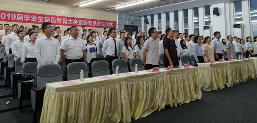 6月13日晚,化工院在明志樓B105舉行了2019屆畢業生黨員教育大會暨新黨員宣誓儀式。化工院黨委書記王兵、黨委副書記陳剛、院組織委員范逸軒、學院全體教工黨支部書記、全體學生黨支部書記以及2019屆全體畢業生黨員和新發展黨員參加了本次活動。會議由陳剛主持。