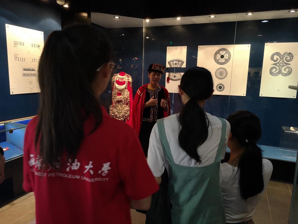 實踐隊在結束了文化創意園之行后,于7月19日下午一點抵達了涼山彝族奴隸社會博物館進行后半段視頻素材的拍攝。下午的拍攝任務主要由負責成員以口述的形式在博物館的濃厚民族氛圍中進行彝族特色服飾的介紹。本次講解分為女子服飾、男子服飾、鑲花邊的來由三個部分,在介紹中也提及了手工店老板談到的彝族男女都外披著的“察爾瓦”和彼氈。察爾瓦和披氈是彝族男女老幼必備之服,白天為衣,夜里為被,擋雨擋雪,寒暑不易。在昭覺之行中,實踐隊也親眼見到昭覺人民身著“察爾瓦”來抵擋風雨。博物館之行,實踐隊以彝族傳統服飾為切入點對彝族文化進行宣傳,希望借此讓更多人去認識這個發源于山間的淳樸而勇敢的民族,去了解古樸而神秘的彝族文化。