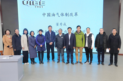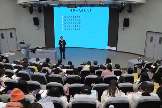 11月30日下午,經管院聯合科研處、四川石油天然氣發展研究中心舉辦的“中國油氣體制改革”學術講座在思學樓C110舉行,對外經濟貿易大學董秀成教授擔任主講人,港華燃氣投資有限公司成都分公司財務經理孫春霞、四川省燃氣集團有限公司黨委副書記、總經理李文冰、四川省燃氣集團有限公司黨委副書記、紀委書記歐亞、四川省燃氣集團有限公司副總經理陳志達、外語學院副院長李虎、經管院黨委書記黨劉栓、副院長鄭小強出席本次講座。部分教師和研究生參加了報告會。