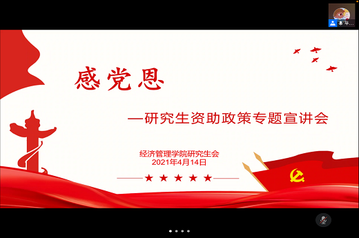 為切實強化研究生資助育人導向,引導研究生增強感恩意識和誠信意識,著力發揮資助育人功效,學院于4月14日晚上7點通過騰訊會議平臺線上召開了“感黨恩”研究生資助政策專題宣講會。此次會議由獎助學金獲得者張家豪主持,2019級和2020級全體研究生參與了此次會議。