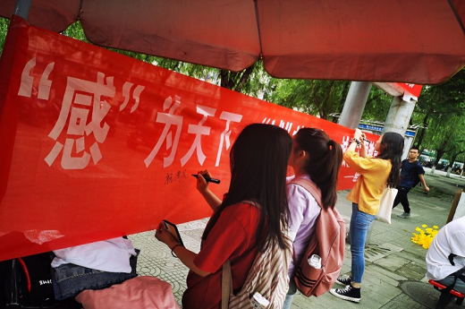 上午11點,研究生會委員到達申請場地(一食堂十字路口),將簽名橫幅懸掛在適當高度,準備好簽字筆,為此次簽名活動做好準備。中午12點,同學們經過十字路口主動上前咨詢工作人員相關事宜,并積極參與活動進行簽名。橫幅上的一筆一劃體現出了廣大師生心懷感恩、誠實守信的美好愿景和鄭重承諾。校國旗護衛隊的同學也參與到其中,在采訪中表示對此次活動深切贊同,并感慨道:“社會幫助我們,我們也要積極回報社會”。簽名活動結束后,全體研究生會成員進行了合影留念。