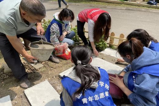 活動開始前,負責人帶領同學們熟悉了相關工具,并且詳細講解了活動的流程與注意事項。同學們在專業人士的指導下鋪設石板路、安裝小柵欄并擺放了花盆,在新建的水泥小道上還留下了屬于自己的手印,最后大家在社區書記的帶領下一起去參觀了退休教職工的活動室,現場氣氛融洽,同學們在交流中受益匪淺。