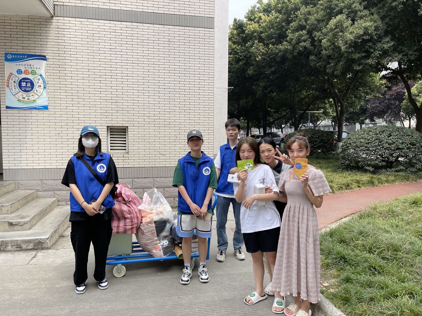 活動開始前,組織活動的同學提前聯系西南石油大學學子愛心超市,確定了書簽、校徽、石大定制鋼筆等兌換物品,并在全院進行宣傳,開展勞動教育,鼓勵每位學生參與本次勞動實踐。作為畢業季活動,即將畢業的學生大多需要處理廢棄的被褥、衣物和書本等物品,負責回收的同學提前聯系并預約回收時間,在活動舉辦的幾天內上門回收并稱重,并將重量轉化為對應的積分,供畢業生兌換相應的石大紀念品。活動最后,同學們將活動中所收集的可回收物分類歸納放入環保銀行倉庫中并拍照紀念。至此,本次環保銀行“鑄環保?憶往昔”畢業季活動圓滿結束。