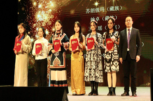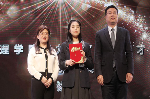 招就處副處長肖友平,四川省五一勞動獎章獲得者、四川師德楷模、學校教師飛翔獎—教書育人獎獲得者梁琳為文藝獎獲得者李冰頒獎