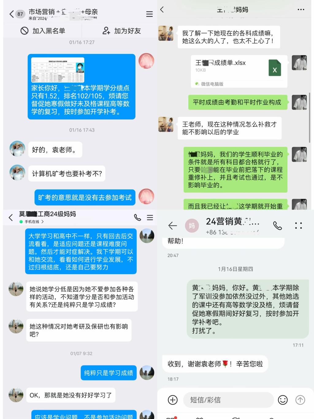 天津?qū)W生小莫本學(xué)期學(xué)業(yè)成績較差,輔導(dǎo)員劉波通過電話+網(wǎng)絡(luò)交流相結(jié)合的形式,與學(xué)生的父母詳細(xì)分析了學(xué)生成績不佳的原因,共同探討改進(jìn)方案,制定階段性學(xué)習(xí)目標(biāo)。