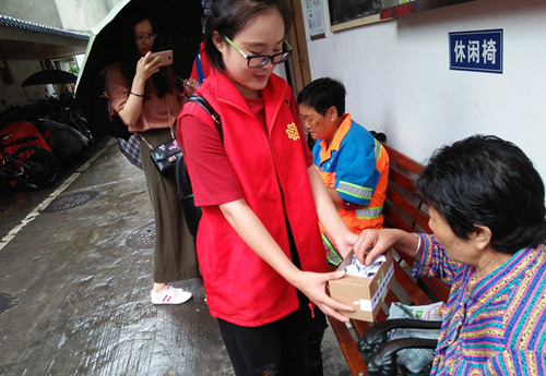 本次活動共分為兩個環節。在第一個環節中,新中社區的居民們很積極配合實踐隊填寫關于環保問卷,就出行方式、購物袋的選擇、生活垃圾處理以及對于綠色發展理念的理解等這些問題表達了自己的看法。其中一位阿姨這樣回答道:“就購物袋來說,現在大多數人都還仍然在使用會造成環境污染的白色塑料袋,不過現在也有一小部分人使用的是布袋子了,布袋子既環保又方便,希望更多的人能使用環保袋?!痹谔顚憜柧淼耐瑫r,每組志愿者都攜帶了一定數量的環保袋,在對社區居民問卷調查完后就進行發放。這一做法不僅使社區居民更加熱情地參與進來,還充分實踐了“綠色生活”的主題。