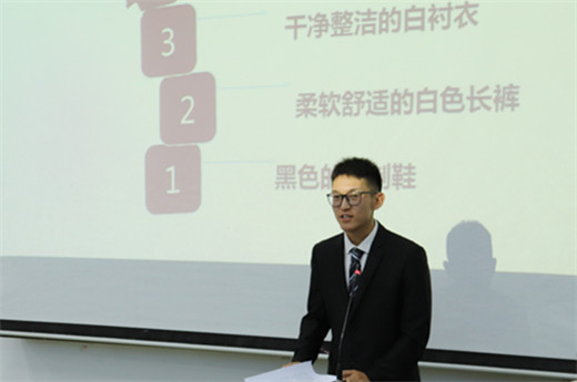2017級市場營銷的蘆陽,一個來自甘肅的小伙,他用自己兒時故事講述回族衣著及民俗文化的點滴。整齊、美觀、簡樸舒適、大方簡潔卻少不了伊斯蘭的圖案作為裝飾作為回族服飾的幾大亮點,這充分表現出回族人民的宗教信仰和民俗風情。他講道:“民族的東西一定不要被同化,被淹沒,被遺忘。越是民族的,就越是世界的;越是有地方特色的,也就越是有獨特競爭力的。”
