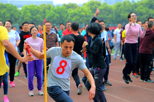 聚焦賽場,五十米迎面接力跑比賽在歡呼聲中拉開序幕,一聲槍響,老師們手中緊握小小的木棒,即使摔倒他們也不輕言放棄,忍痛跑完全程。他們聽不見場外同學們的加油吶喊,如雷的心跳在耳邊提醒著快點,再快點,要將勝利傳遞。接力棒如同他們的信念,為了學院而戰、絕不放棄。教職工們參加運動會不僅是對體育精神的發揚,也是和學生共同奮斗的詮釋。