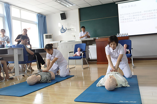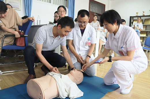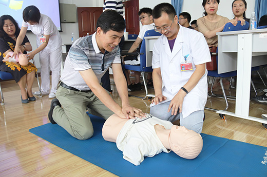 鄒劍戎首先用幾個典型案例強(qiáng)調(diào)了此次培訓(xùn)會的重要性,隨后針對海姆立克急救法的操作方法進(jìn)行了系統(tǒng)闡釋,在他講解的同時,現(xiàn)場有醫(yī)護(hù)人員進(jìn)行模型演練與真人演示,針對個別技巧處,還做了細(xì)節(jié)展示,給老師們帶來更加直觀生動的動作講解。在這樣的細(xì)致教學(xué)下,參會老師們都躍躍欲試,主動向前進(jìn)行模擬訓(xùn)練,想借此檢驗(yàn)自己的學(xué)習(xí)成果,醫(yī)護(hù)人員在一旁進(jìn)行耐心指導(dǎo),解疑答惑,現(xiàn)場學(xué)習(xí)氛圍濃厚。
