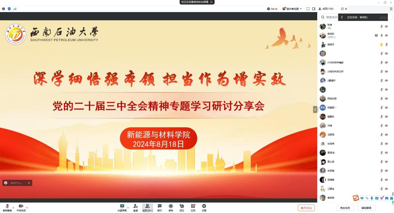 為全面、準(zhǔn)確、深入學(xué)習(xí)和宣傳貫徹黨的二十屆三中全會精神,2024年8月18日19時,新能源與材料學(xué)院學(xué)工隊伍舉辦了一場以“深學(xué)細悟強本領(lǐng),擔(dān)當(dāng)作為增實效”為主題的專題學(xué)習(xí)研討分享會。學(xué)院黨委副書記、紀(jì)委書記張維,全體輔導(dǎo)員,學(xué)生黨支部書記,學(xué)生會、研究生會、學(xué)生社團聯(lián)合會主席團成員,各班級班長、團支書以及學(xué)生代表齊聚一堂,共同參與了此次分享會。