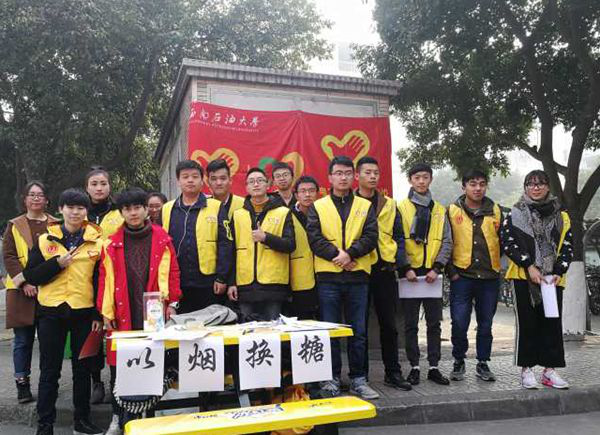 12月22日中午,由材料院及機電院青年志愿者協會聯合舉辦的“校園無煙,以煙換糖”活動在一食堂外順利舉行。
