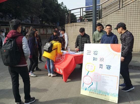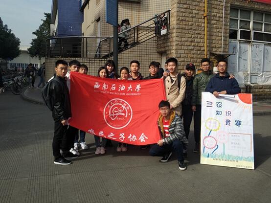 “同學你好,請問我可以參加這個三農知識競賽嗎.......”2017年12月11日,隨著一位同學的詢問聲,西南石油大學農民之子協會舉辦的三農知識競賽宣傳工作如期展開。此次活動宣傳地點設在學校一食堂外,由農民之子協會會長和各理事組織和負責此次宣傳工作。此次宣傳是對三農知識競賽的一個前期準備,以豐富學生的三農知識為主要宣傳內容。