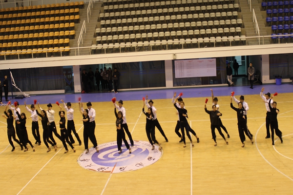 我院此次的舞蹈主題為《花樣年華》,由恰恰舞,桑巴舞以及牛仔舞混搭而成,音樂動感十足,感染人心。舞蹈由十一個男生,十一個女生共二十二人來共同完成。集體舞蹈注重的不是個人的能力,而是相互彼此之間的配合。“默契就是練出來的,我們確定好分組后,就一遍一遍的練習,熟悉舞伴,感受節奏。”舞蹈隊員員趙夢月說?!斑@個過程還是有點難熬的?!薄耙粋€小小的動作在我們看來對整體就是一個瑕疵,所以我們從最基本的動作開始,一步一步的完善,力求完美?!敝档靡惶岬氖?,舞蹈隊員每天晚上從七點練到十點,有時甚至是十一點,他們沒有人抱怨,沒有人退縮,他們一直堅持著舞蹈隊員們為了能夠早日熟悉比賽的環境,很早就穿上了高跟鞋,踩著高跟鞋練習,為了能夠有良好的訓練環境,他們踩著高跟鞋從風雨長廊小跑到體育館,然后開始緊張的排練。