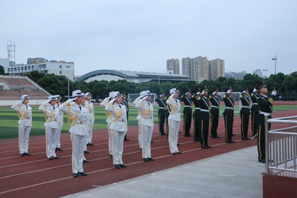 “五星紅旗迎風飄揚,勝利歌聲多么響亮……”國旗護衛隊合唱《歌唱祖國》,清脆的歌聲,穩健的步伐,護衛隊從主席臺繞足球場跑道行進至旗臺。伴隨著莊嚴的國歌,國旗緩緩升起,全體人員齊唱國歌,清晨的石大充滿了朝氣與希望。