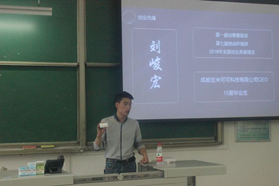 通過分享自身及其他參賽者的經歷,劉峻宏向同學們闡述了三個觀點:第一,先懂得創新再去創業。第二,大一要敢于參加各類比賽,積累經驗。第三,擁有自己獨特技術及專項能力更易成功。最后,劉峻宏拿出他們公司的最新產品向同學們證明了,只要敢想敢實踐,就會有成果。