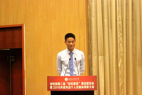 獲得“材料菁英”的各位學生標兵分享成長故事,將大會推向了高潮?!皟炐銓W習標兵”劉麗艷回顧了自己如何努力成為一名倔強不服輸的女學霸,“學術科技標兵”岳杰描述了自己與西南石油大學的10年緣分,“社會實踐標兵”王一珺將自己的實踐經歷娓娓道來,“宣傳寫作標兵”楊昌奎講述了活動背后宣傳寫作的那些事兒,“自立自強標兵”曾強用一段小魔術告訴我們如何用魔術改變命運,“文化體育標兵”王滔暢談競技場上的笑與淚,“媒體制作標兵”龍文俊淺說PPT制作的魅力與神奇,“最佳團隊”2014級材控卓越班展現了班級同學團結向上、互助奮進的風貌,遠在瑞士讀博的“特別影響標兵”萬文超送上了對師弟師妹們的鼓舞。其間,穿插著由文藝部同學帶來的青春舞曲,靈動的舞姿毫不保留地彰顯青春活力,使分享跌宕起伏。