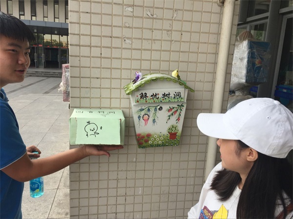 5月14日下午,心健部部長蔣旭與代理部長陳玉將“解憂樹洞”放置在明德樓b區門口,宣布活動的正式開始。據蔣旭部長所說,從有了關于活動的具體想法開始,他們就開始積極的準備著,無論是前期宣傳時絞盡腦汁迸發出的靈光一閃,還是制作“解憂樹洞”時灑下的汗水,都意味著每一位工作人員的不辭辛苦。還有在活動即將開展時,他們發現樹洞還有些許瑕疵,就是寄信的同學沒有取信的地方。所以他們又緊急趕制了“回音樹洞”來存放回信。“盡管過程會有些辛苦,但一想到能夠用自己的一些建議,去幫助到同學們,就覺得這些不算什么了。”陳玉同學如此說道。