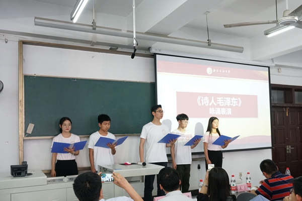 一場《詩人毛澤東》的詠誦表演拉開了分享會的帷幕,振聾發(fā)聵、撼動靈魂,向觀眾們描繪一代偉人毛澤東的詩人形象。有“孩兒立志出鄉(xiāng)關(guān),學(xué)不成名誓不還!”的決心 ,有“今日長纓在手,何時縛住蒼龍”的雄心,也有“書卷多情似故人,晨昏憂樂每相親”的柔情。趙夢月等6位同學(xué)所詠誦的激揚(yáng)文字,激勵著“恰同學(xué)少年,風(fēng)華正茂”的當(dāng)代青年學(xué)子以拳拳愛國之心,明殷殷報國之志。
