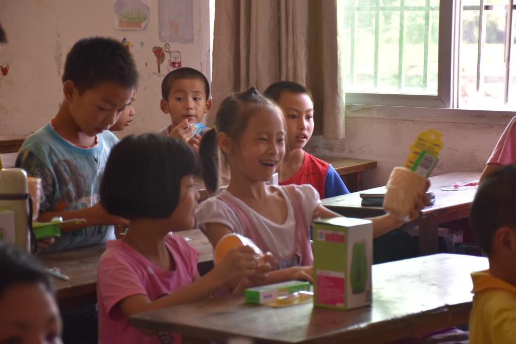 良好的衛生習慣將使人受益一生,從小就養成良好的衛生習慣,有利于小朋友們健康快樂地成長。在進行了前期的調研后,我們發現,當地的小孩多為留守兒童,與爺爺奶奶一起生活。由于老人家自身條件的限制,孩子們大多數沒有刷牙的習慣。支教隊特別設置了健康與安全(衛生)課,并購置了足夠的牙刷,牙膏與漱口杯。當天上午10點15,在講解了牙膏牙刷的種類和使用方法后,支教隊向孩子們發放了免費的牙膏、牙刷與漱口杯。可能是第一次見到這些東西,一些孩子們將這些小東西抓在手中,明亮的小眼睛一閃一閃,透著一點開心、一點好奇。物品發放完,何老師帶著孩子們現場演示如何正確刷牙,“首先,將牙膏擠一點在牙刷有毛的那一面上,像老師這樣……”孩子們圍在老師周圍,幾位同學和老師一起向大家演示刷牙。