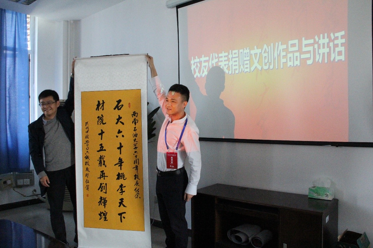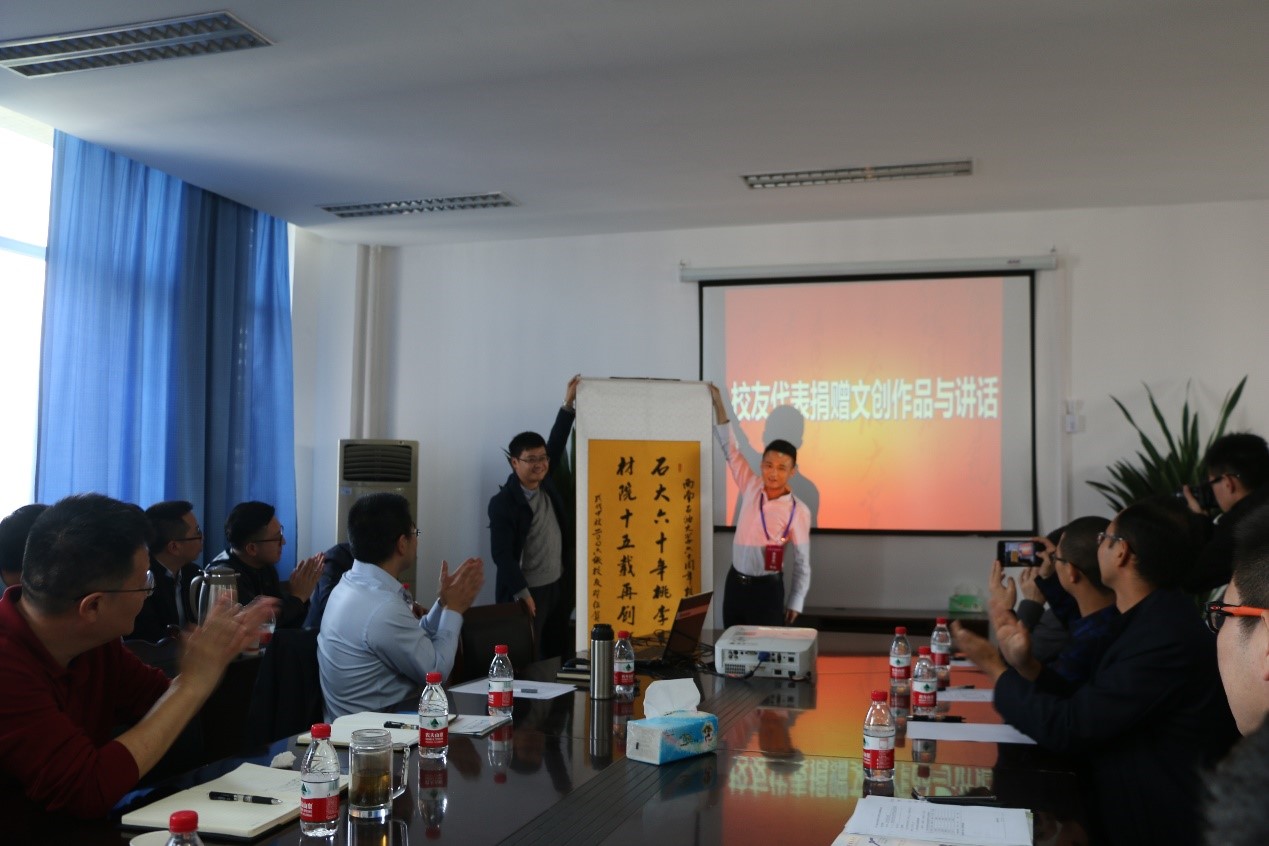 校友代表鄧伍為學院捐贈了一幅書畫作品,來表達自己對學校和學院的感激與懷念。他表示,正是因為有學校和學院提供的平臺,他才能有現在的成就。戴志書記表示希望廣大校友今后能進一步宣傳學院、關心學院、支持學院。