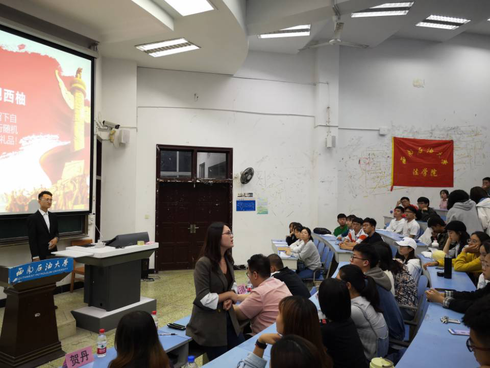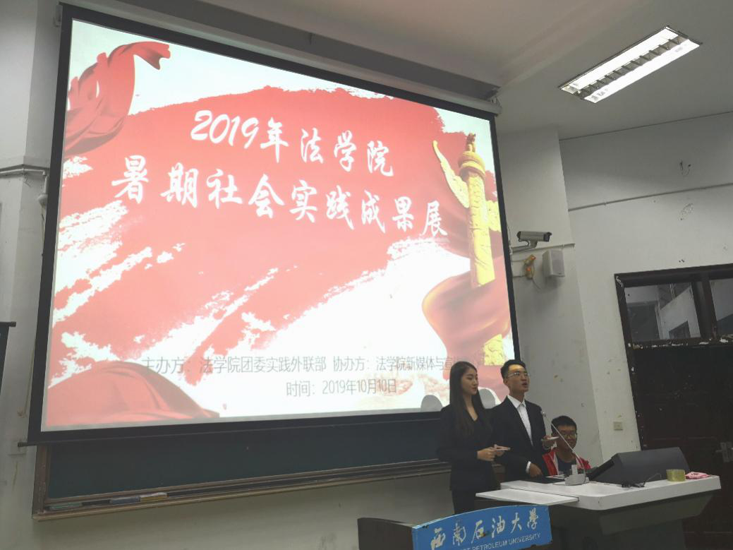 為了進一步增加2019級新生們對暑期社會實踐的了解,增強學生們對社會的認知,西南石油大學法學院于10月10號晚上19點在思學樓C110成功舉辦暑期社會實踐成果展,來自2018級的同學詳細展示了他們在暑期社會實踐的成果。參與本次展示會的嘉賓有法學院2019級輔導員楊可瀚老師,法學院團委秘書長彭雪琴,法學院團委副秘書長趙懷博,學生會副主席王若愚、賀丹。夢溪易行實踐隊,“重走長征”社會實踐,鄉柚憲行實踐隊,學法有為實踐小隊,青拾屏山隊,“青初”美麗中國七支校實踐隊進行成果展示,展示會現場氣氛熱烈。