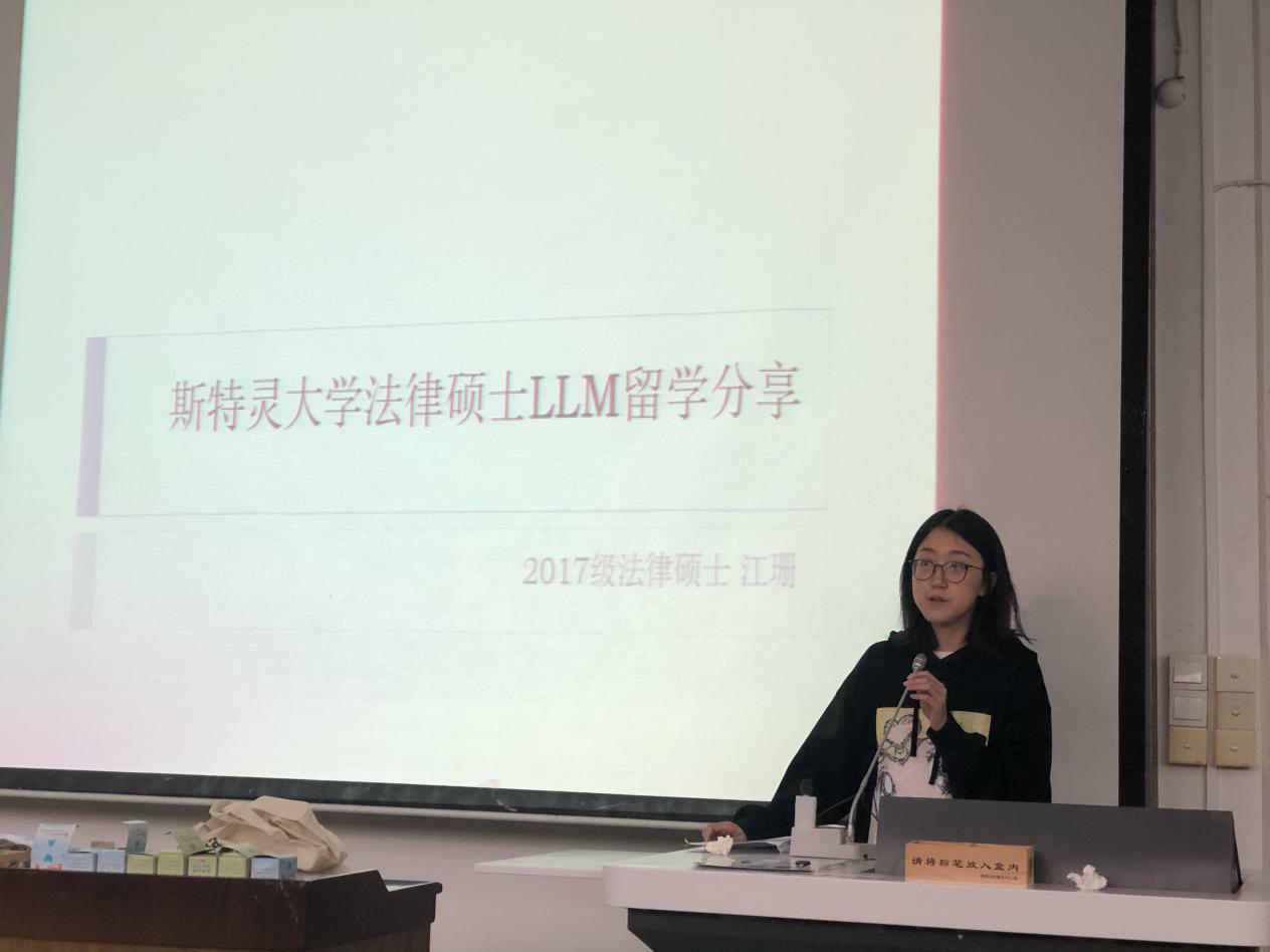 除此之外,斯特靈大學在日常生活中也會為學生提供便利的醫療、交通等方面服務,為學生安排負責老師,提供幫助。我校2017級法律碩士留學生江珊向同學分享自己在留學期間的優美風光照片、學習心得、豐富的課外活動,減少了有意留學學生的后顧之憂,同時以生動形象方式為同學們展示了留學生活的精彩和獨特的收獲,向大家傳達身在異國他鄉既是一種學習技能上的磨煉,也是特別的生活體驗。在最后的問答環節,同學們積極提問,Grace Wang耐心詳細地解答,并給出了有針對性和實質性的建議,幫助同學們對斯特靈大學形成一個較為全面的認識,幫助有相關留學意向的學生找到方向。