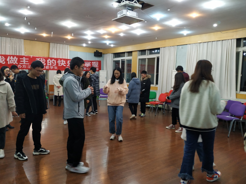 其后的篇章名為“生活的節拍”,肖丹老師用快慢相間的節奏指引同學們在閉眼的狀態下跟著節拍交互向前走。開始時大家都畏畏縮縮地邁步,小步小步試探著向前。在漸漸適應后,同學們逐漸放下自己的不安,跟著節拍的律動或快或慢地向前行走。這個環節的設計是希望同學們能夠體會到快節奏的生活所給大家帶來的焦慮感,在黑暗中體驗對未知的那種不安,通過自我探索去大膽嘗試,消除內心的不安,讓學生在體驗當中訓練和提升心理意志品質。肖老師在這個環節后,也與同學們分享了幾種常見的調節情緒的方法。