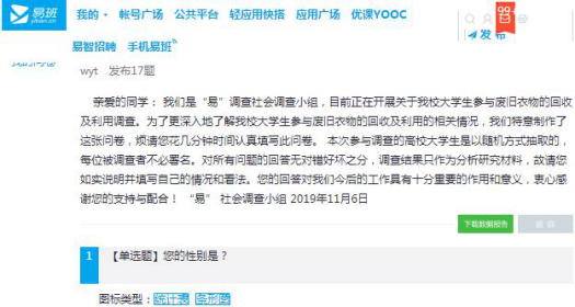 為深入了解西南石油大學在校大學生對廢棄衣物的處理情況,對校內衣物回收處理提供相關具體可行的建議,促進校園環保活動的有序開展,西南石油大學“易”小組通過聯系校、院易班,對接各個班級的方式,于2019年11月2日至2019年11月16日對西南石油大學生廢舊衣物回收情況進行了線上易班輕應用、線下班級主題班會、進寢室派發問卷等方式進行問卷調查。