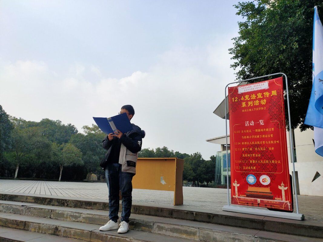 為普及憲法法律知識,弘揚憲法精神,提高在校大學生的法治意識,凝聚法律共識。12月15日下午,由西南石油大學法律協會主辦的12.4憲法演講與宣誓活動在博學廣場順利舉行。活動開展井然有序,取得了良好的效果。
